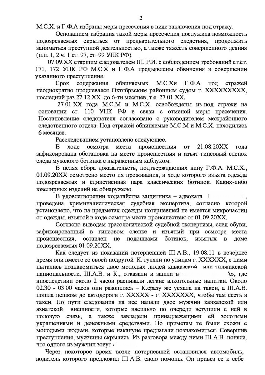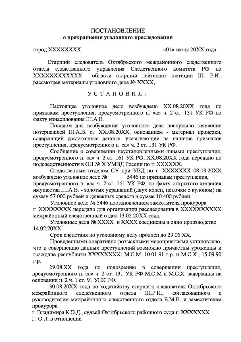 Адвокаты в Новокузнецке добился прекращения уголовного дела на стадии предварительного расследования по реабилитирующим основаниям в отношении двух граждан иностранного государства обвиняемых органами предварительно следствия в совершении преступления предусмотренного п. «а» ч.2 ст.131 УК РФ (изнасилование совершенное группой лиц) и п."а" , п."г" ч.2 ст.161 УК РФ (грабёж), наказание за которое предусматривает лишение свободы от восьми до пятнадцати лет, то есть преступление, которое в соответствии с ч.5 ст.15 Уголовного Кодекса Российской Федерации отнесено к категории особо тяжких преступлений.